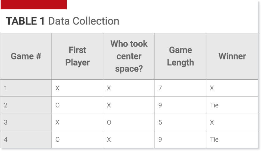 Here’s an example of the type of data you might collect in Tic-Tac-Toe:
