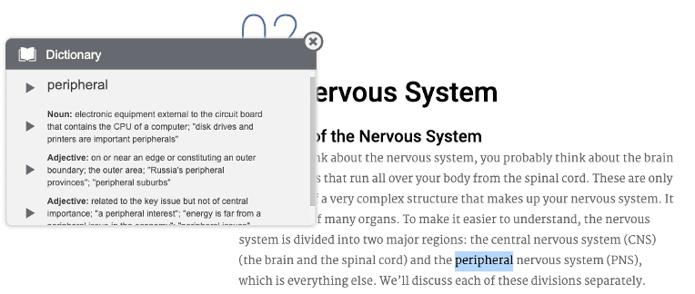 Students may encounter complex vocabulary in their secondary years. Using the dictionary option, students stay engaged even when they come across words they may not understand. Students highlight the word and choose the dictionary button to get the definition. They can optionally have the word read to them to help with pronunciation. And, the pictionary option will provide an associated image if one is available. These features are especially beneficial to students when they’re learning complex career terminology.