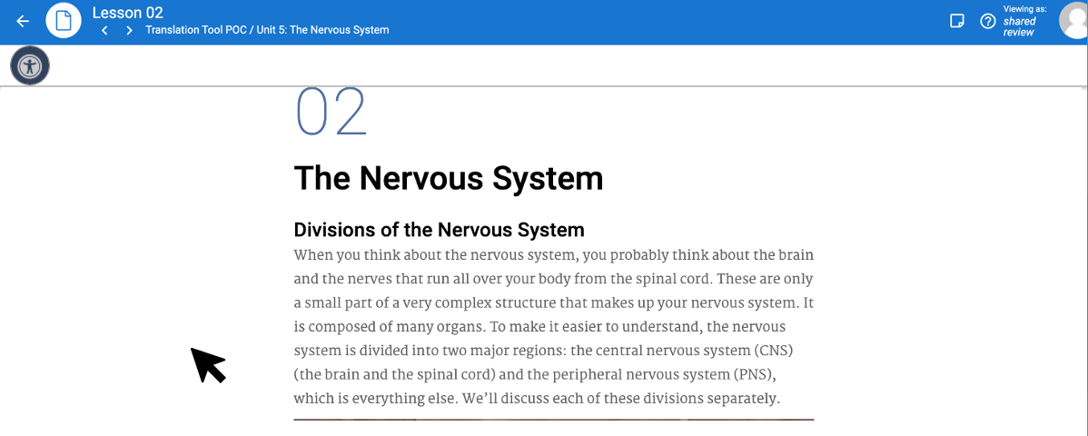 It is available through an accessibility icon located on the upper left-hand corner of the lesson and activity pages. The placement ensures the course appearance remains ‘clean’ and minimizes learning distractions. Additionally, the toolbar is designed to “float” off to the side of course content as a student scrolls through the page. Together, the placement and function provides ease-of-use and minimal disruption to learning.
