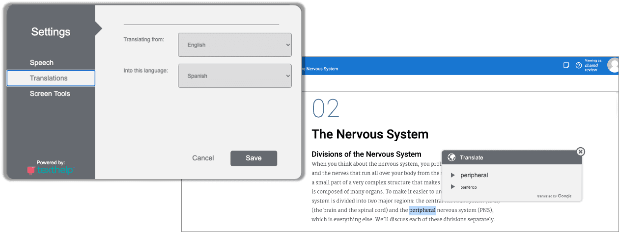 English Language Learners (ELL) students and students taking foreign language classes will love the translation feature! The Literacy Support Toolbar allows learners to select the words or phrases they want to be translated and/or read aloud in over 90 languages! The translation option promotes continuous learning by giving ESL students the support they need when they need it by reducing language barriers.