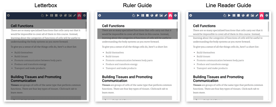 A screen mask option allows students who may be easily distracted or struggle with reading to focus on one line at a time. Screen mask overlays reduce visual stress on students with reading challenges; including students with dyslexia and other learning disabilities.